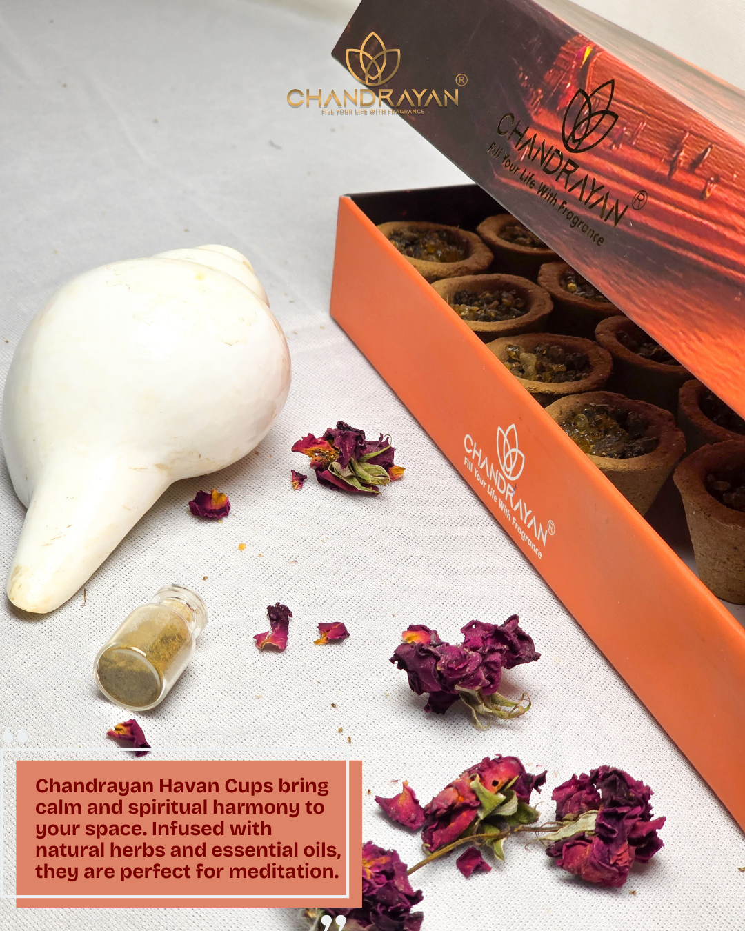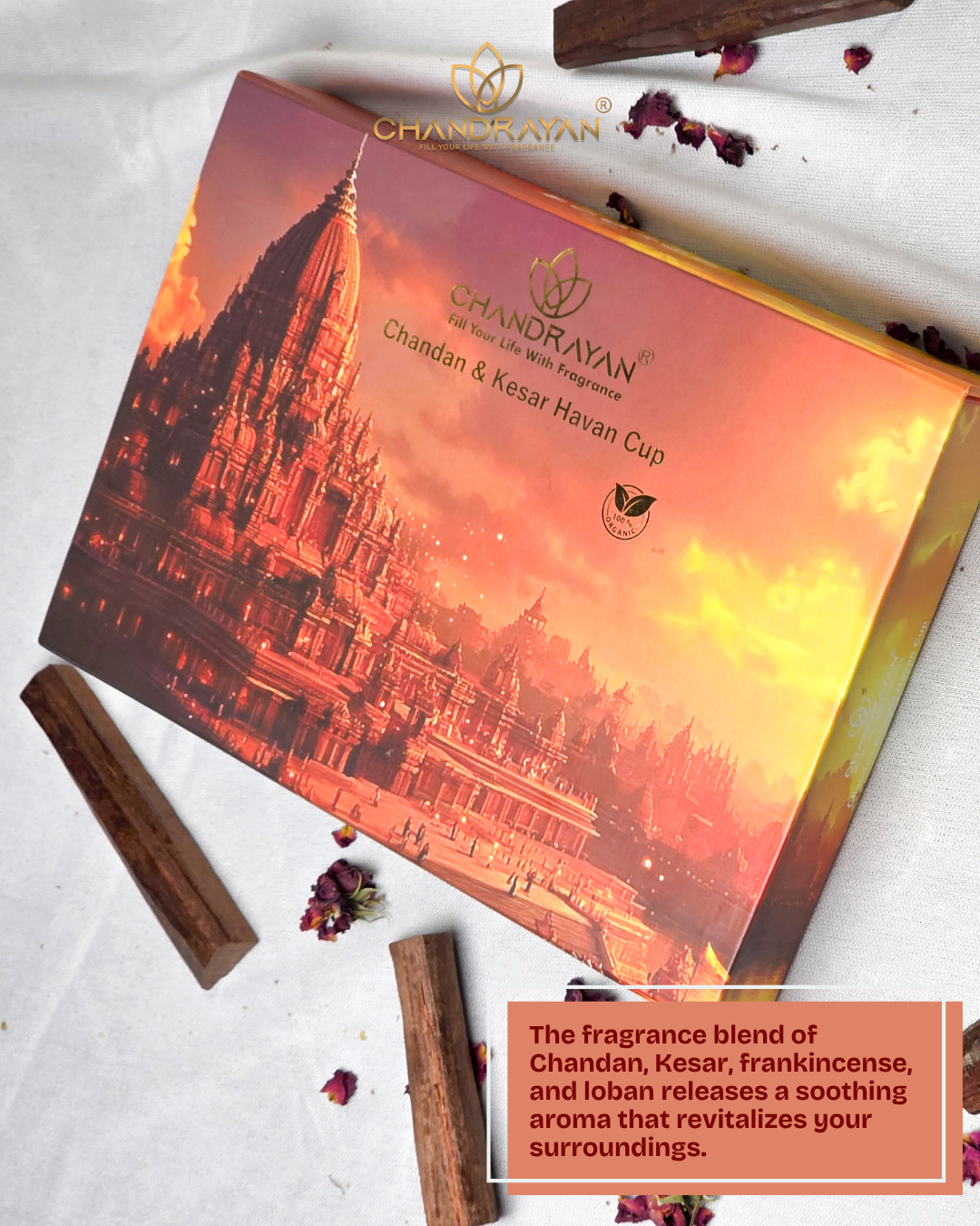 Chandrayan invites you to experience tradition with our enchanting Havan Cups, infused with the exquisite fragrances of Chandan, Kesar, and the rich essence of frankincense essential oil. Each cup is meticulously crafted to release a soothing aroma, blending the earthy richness of chandan, the luxurious warmth of kesar, and the calming aromatic properties of pure frankincense oil and loban. This unique combination evokes tranquility and revitalizes your space with every burn. Handcrafted by skilled women artisans from our NGO, Save Child Life, these eco-friendly cups seamlessly combine luxury with sustainability, using recycled temple flowers and essential oils for an authentic, holistic experience. Each box contains 15 cups and a ceramic holder for easy use. By choosing Chandrayan, you support a meaningful cause, as we donate 10% of our profits to advance child health and education. Light a cup and let the captivating essence of chandan, kesar, frankincense, and loban envelop your home, creating a serene sanctuary. Discover the harmony of heritage, nature, and purpose with Chandrayan Havan Cups.