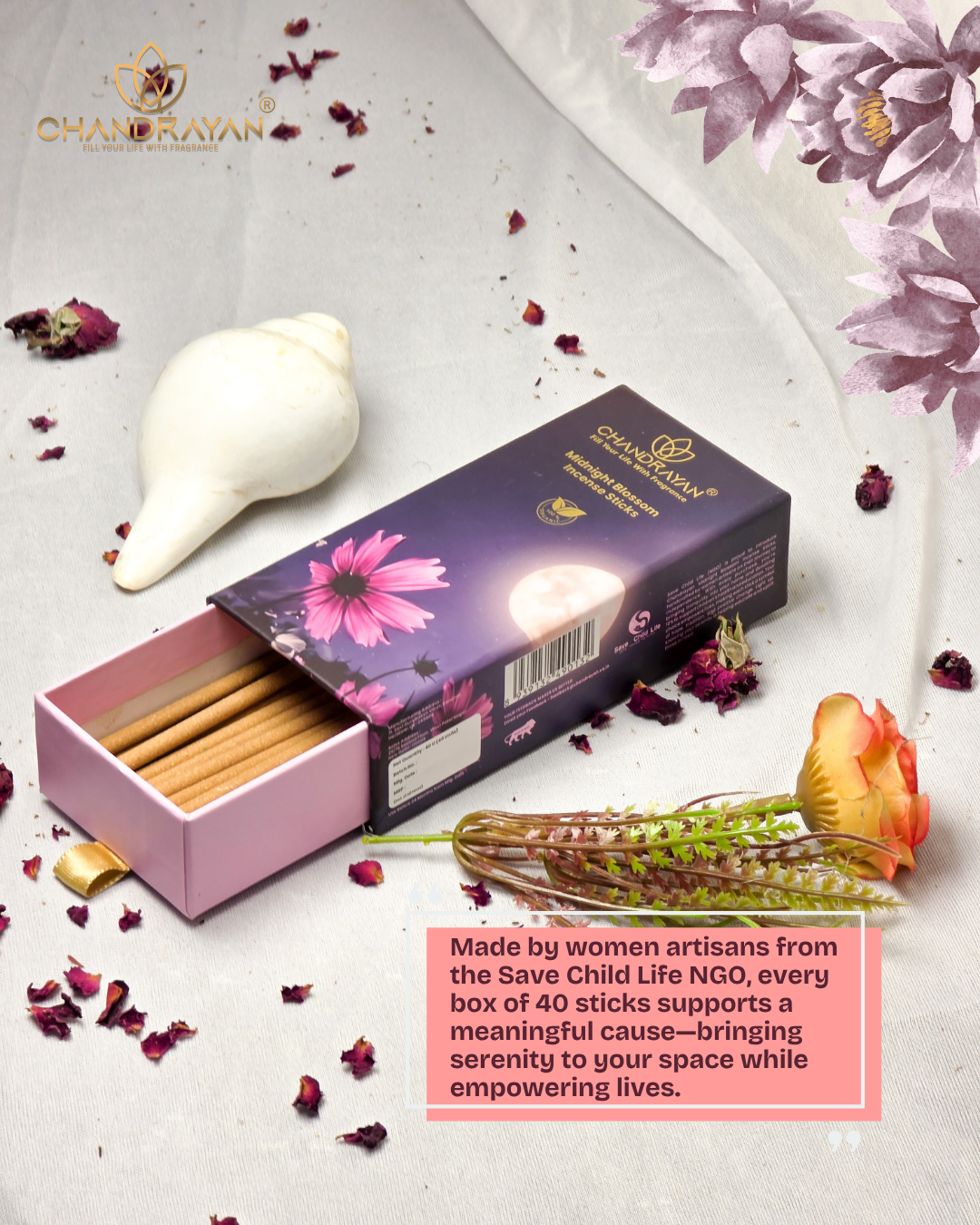 A portion of every purchase directly supports child welfare programs and women’s employment initiatives. When you light a Midnight Blossom Incense stick, you spread wellness—both in your home and across communities in need.