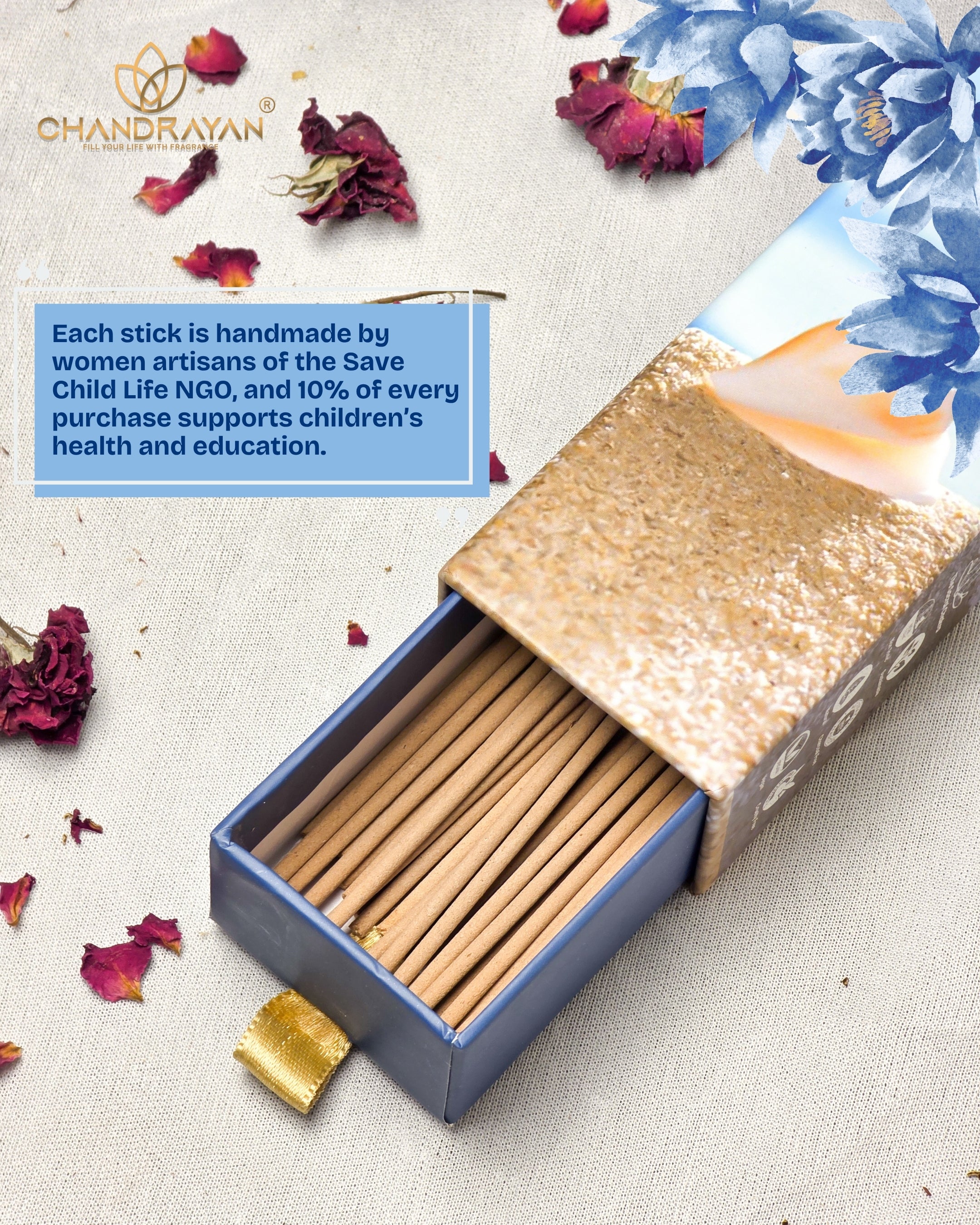 Chandrayan is committed to offering premium, handcrafted incense made with natural ingredients—while empowering women artisans through the Save Child Life NGO. Every purchase supports livelihoods and keeps India’s cultural craft alive.